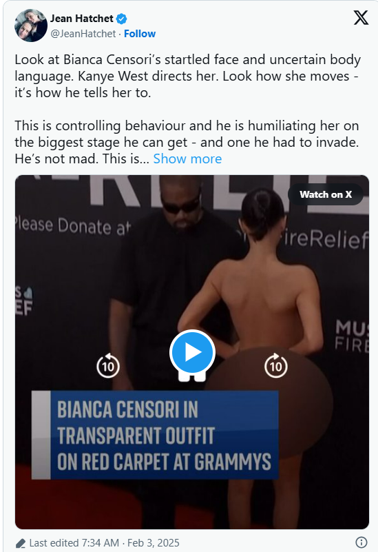 A second netizen offers, “Look at Bianca Censori’s startled face and uncertain body language. Kanye West directs her. Look how she moves – it’s how he tells her to.”