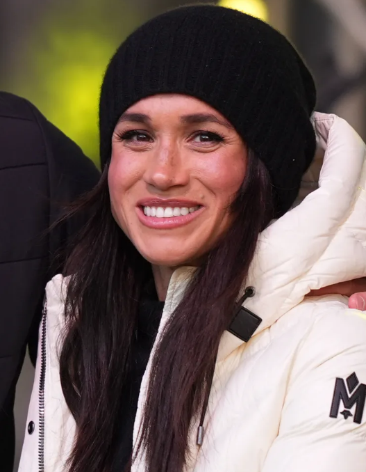 Meghan made a radiant appearance in a cozy yet stylish winter ensemble. She donned a crisp white puffer jacket emblazoned with the letter “M” on the sleeve, and a sleek black beanie that framed her face, highlighting her naturally glowing complexion.