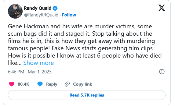 Among those celebrities to voice opinions on the tragedy was Randy Quaid, who shared his outlandish belief that Hackman and Akawara had been murdered.