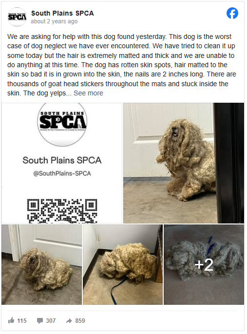 On July 16, the South Plains SPCA shared a post about the “worst case of dog neglect we have ever encountered.” A 6-year-old dog was covered in extremely matted, thick fur, and was in poor shape“The dog has rotten skin spots, hair matted to the skin so bad it is in grown into the skin, the nails are 2 inches long,” the SPCA reported.